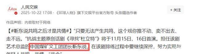《人民日报》点名,暴露真实处境 10月22日,《人民日报》为抗战话剧《寻找“杜立特”》预热那回,一句话就让网友炸了锅。 谁也没想到,人民日报点名靳东时,用的不是“知名演员”,而是“煤矿文工团团长”。